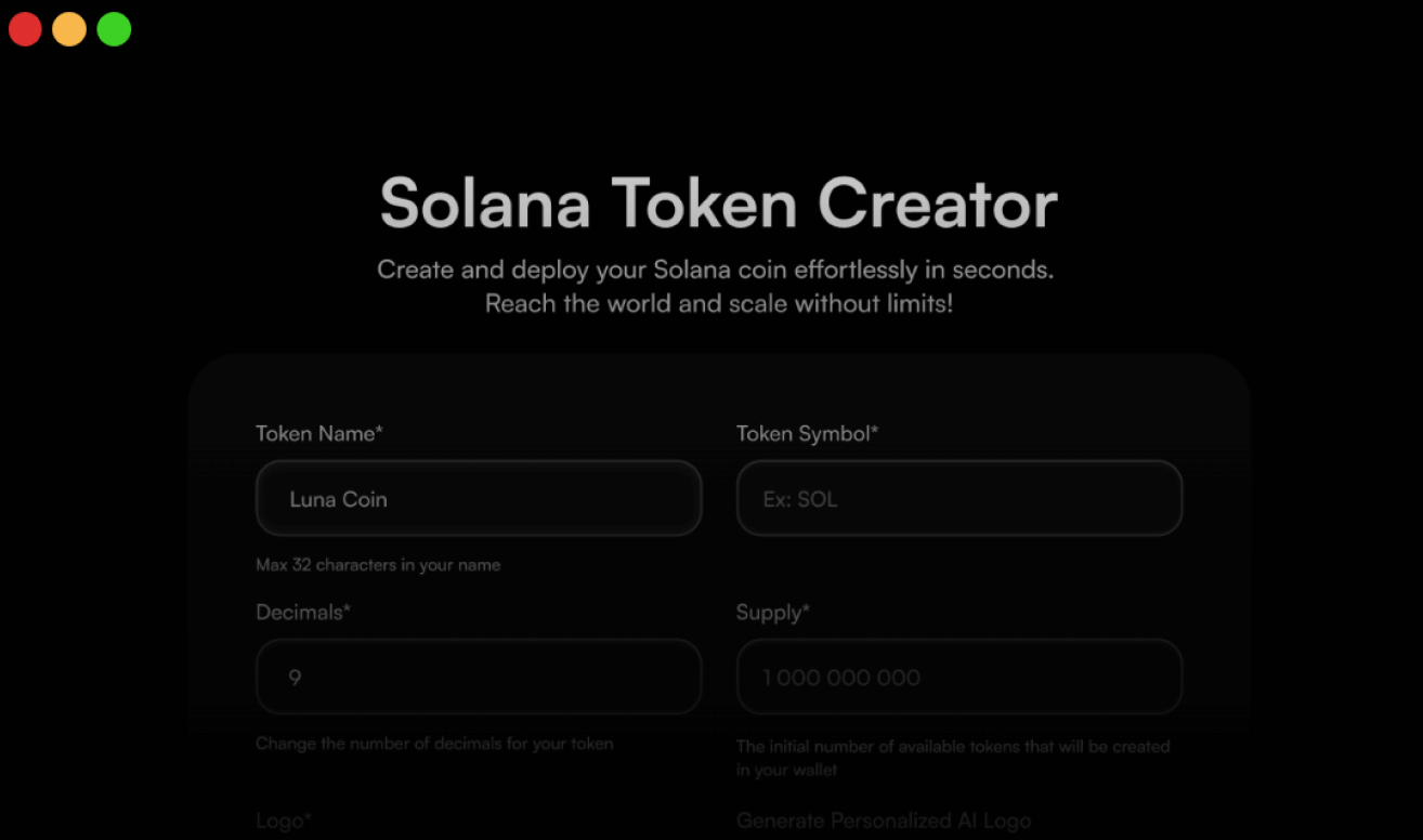 You can easily launch your token on Solana without writing any code by using lunalaunch. Luna launch lets you quickly set up your token by simply entering the key details—such as the token name, ticker symbol, initial supply, number of decimals—and optionally adding an image, description, and social links to round out your token’s profile.